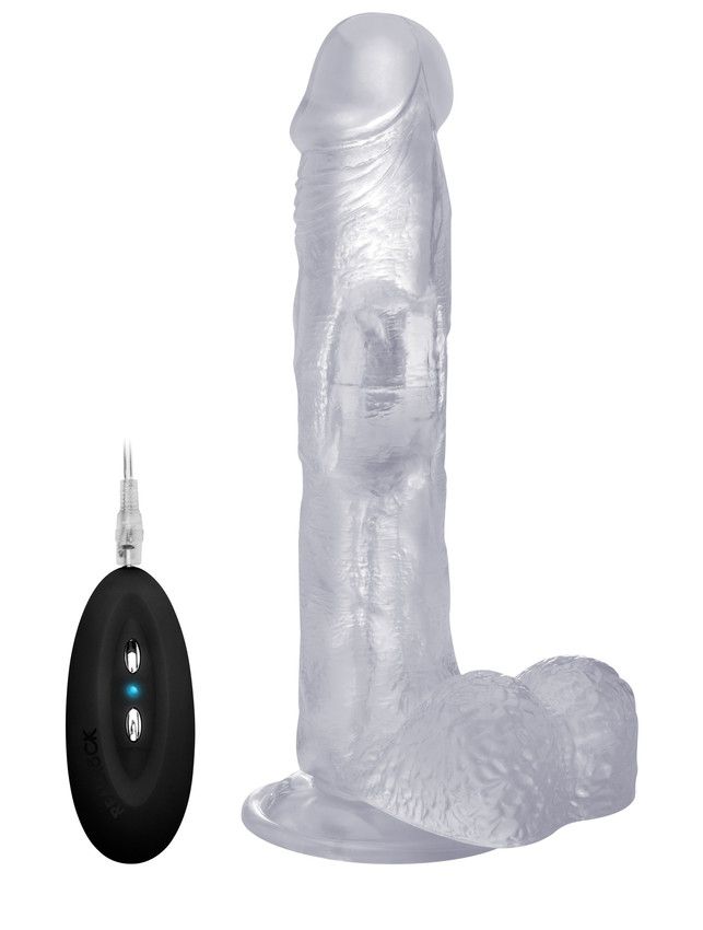 Прозрачный вибратор-реалистик Vibrating Realistic Cock 9 With Scrotum. С присоской в основании и мошонкой для реалистичности ощущений. 10 режимов вибрации. Проводной пульт управления.