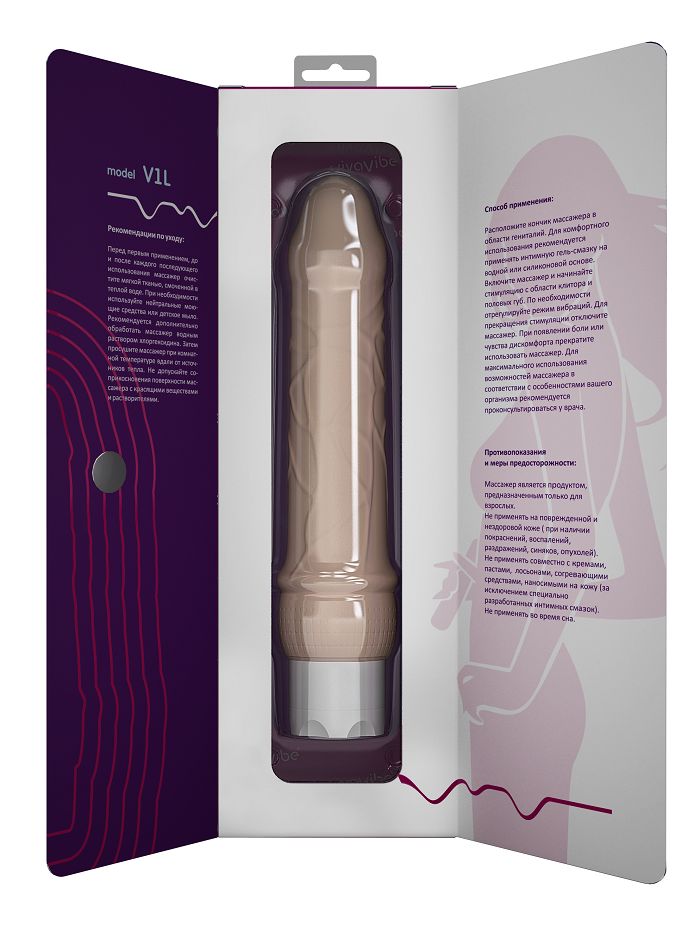 Изготовлен из медицинского силикона, создающего реалистичные тактильные ощущения. С нейтральным запахом и влагоустойчивым корпусом. Анатомическая форма повторяет все изгибы полового члена в эрегированном состоянии. Модель ВиваВайб® V1L создана специально для тех, кому важна естественность. Максимум приятных ощущений! Рабочая длина - 19,5 см. Работает от батареек типа AA ( в комплект не входят).