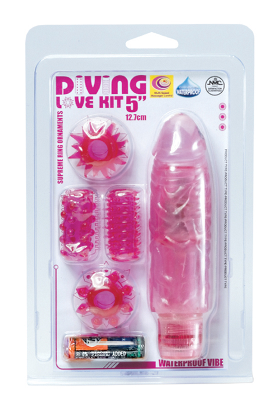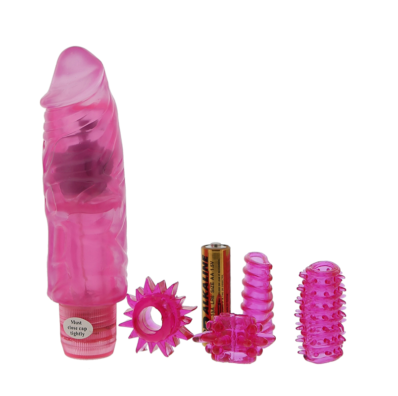 Эротический набор: розовый вибратор, 2 насадки на пенис и 2 эрекционных кольца. Вибратор водонепроницаемый, многоскоростной. Батарейки в комплекте. Длина вибратора - 12,7 см., диаметр - 3,5 см.