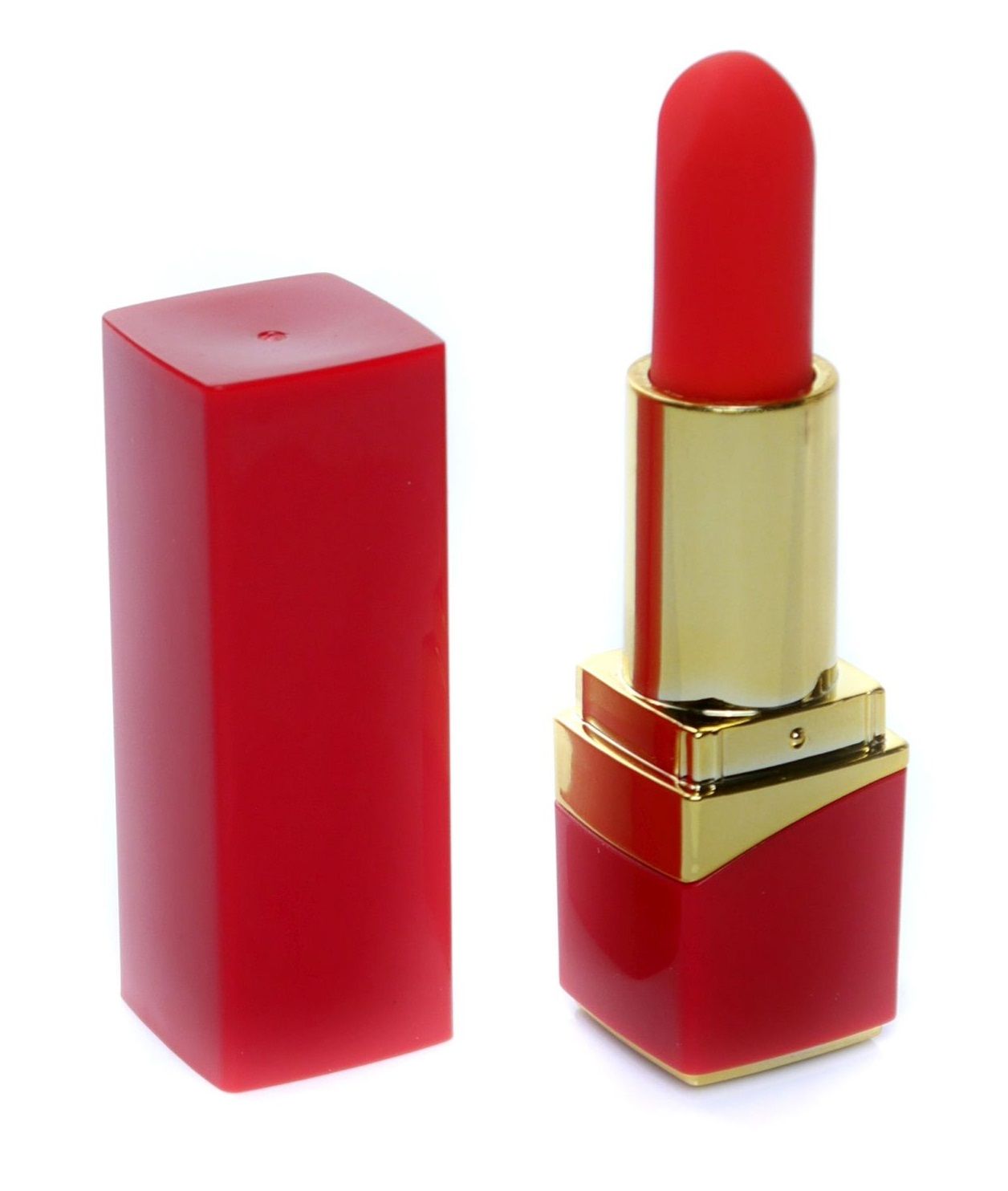 Красный мини-вибратор в форме помады. Имеет 10 режимов вибрации. Зарядка осуществляется с помощью USB-кабеля.