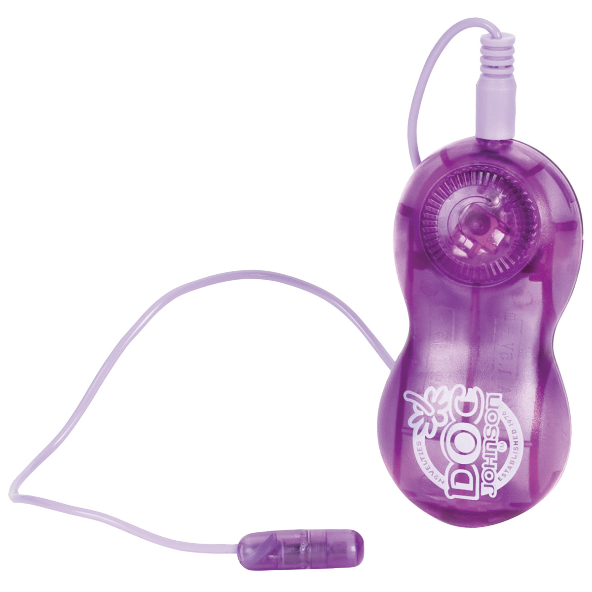Миниатюрная пуля фиолетового цвета с выносным пультом управления. Имеется возможность плавной регулировки скорости вибрации при помощи удобного колесика. Длина - 2,5 см. Диаметр - 1 см.