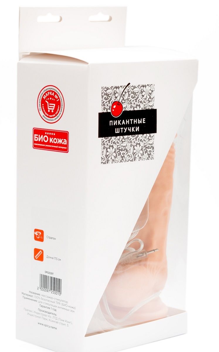 Реалистичный фаллос с мошонкой на присоске, производитель - Пикантные Штучки. Фаллос имеет ярко выраженный рельеф, крупную головку, мошонку, а также присоску у основания для удобного использования. Сделан из высокоэластичного, мягкого и гипоаллергенного материала - биокожи (аналог киберкожи). Имеет 7 вариантов вибрации, включая ротацию, регулируется с выносного пульта. Рабочая длина - 14 см.